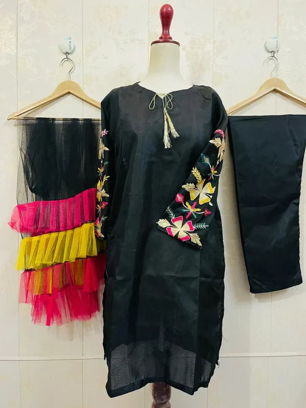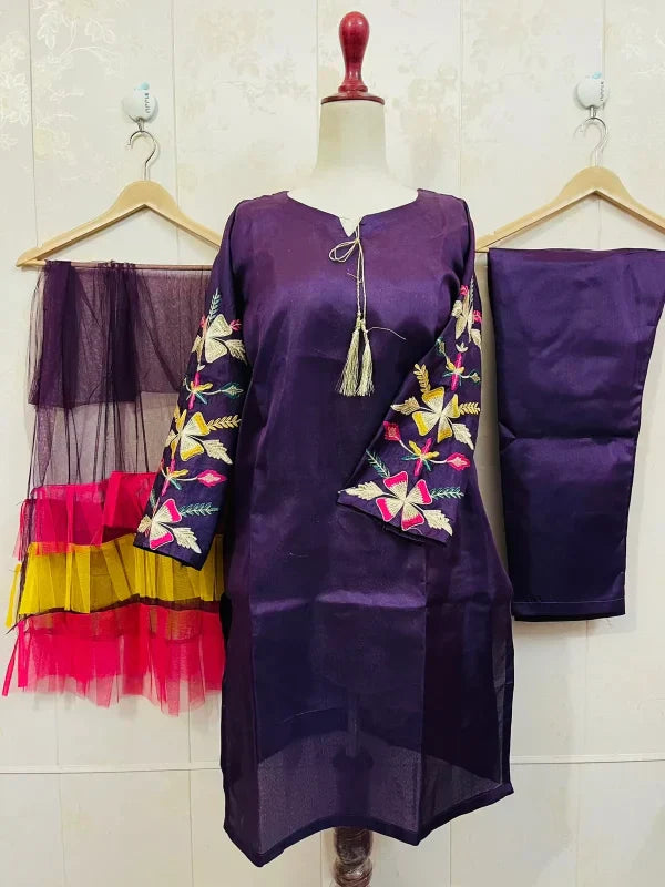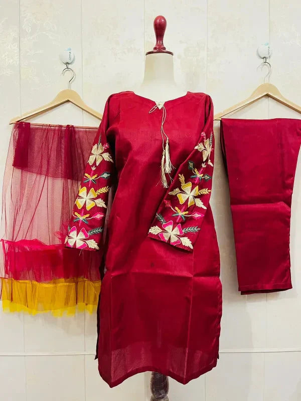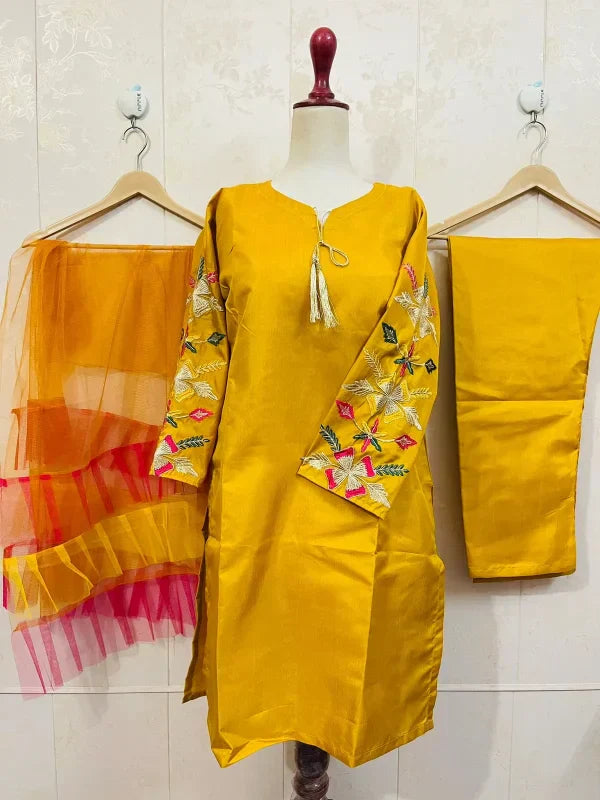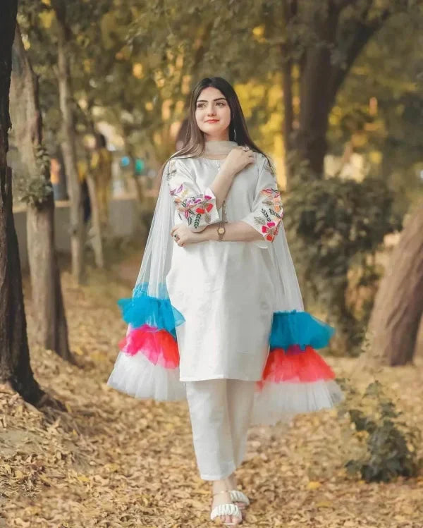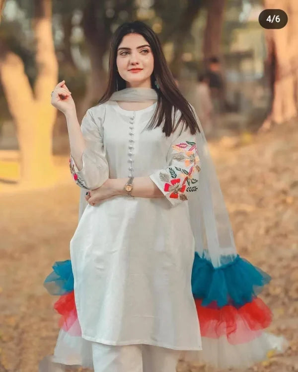 Embroidered Sleeves Kurti With Frill Dupatta & Trouser (3 Piece Suit)